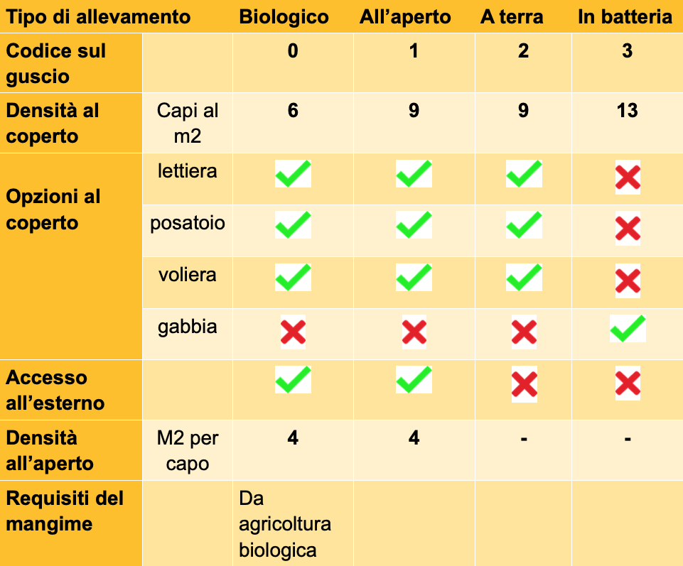 - 1 = indica allevamento all’aperto. I ricoveri hanno posatoi, nidi e lettiere e le galline sono libere di uscire all’aperto durante il giorno.