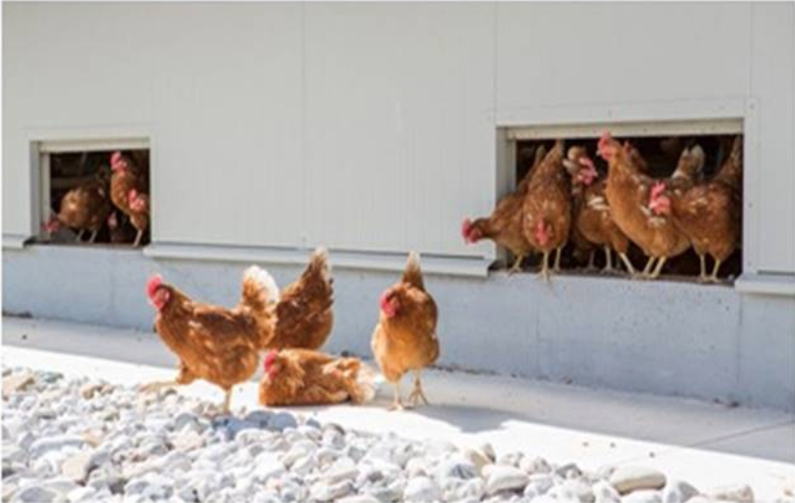1. Allevamento all’aperto: sono previsti un massimo di nove capi al metro quadrato al coperto più un libero accesso all’esterno dove sono disponibili quattro metri quadri per capo. Le galline possono uscire all’esterno grazie ad una serie di uscite posti alla base dei muri perimetrali. All’interno le galline sono libere di muoversi su lettiera e su strutture ad un piano (posatoio) o a più piani (voliera) dove trovano abbeveratoi per l’acqua, mangiatoie per il cibo e i nidi per la deposizione delle uova.