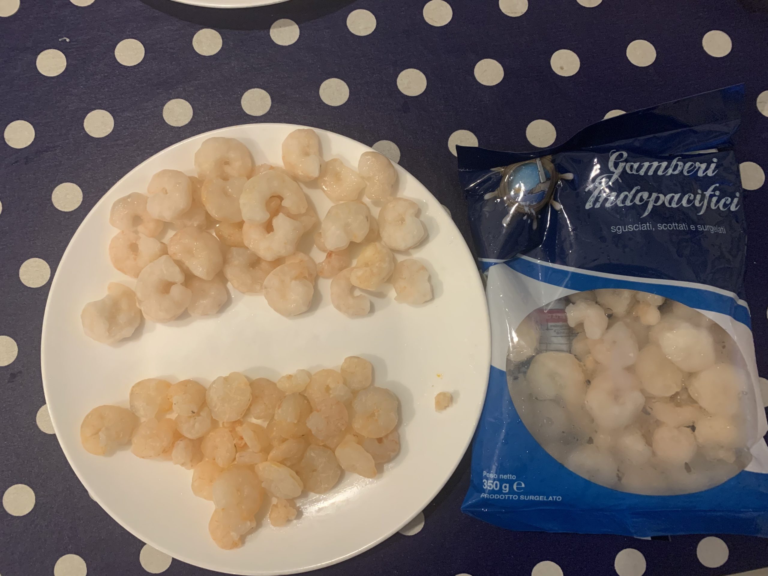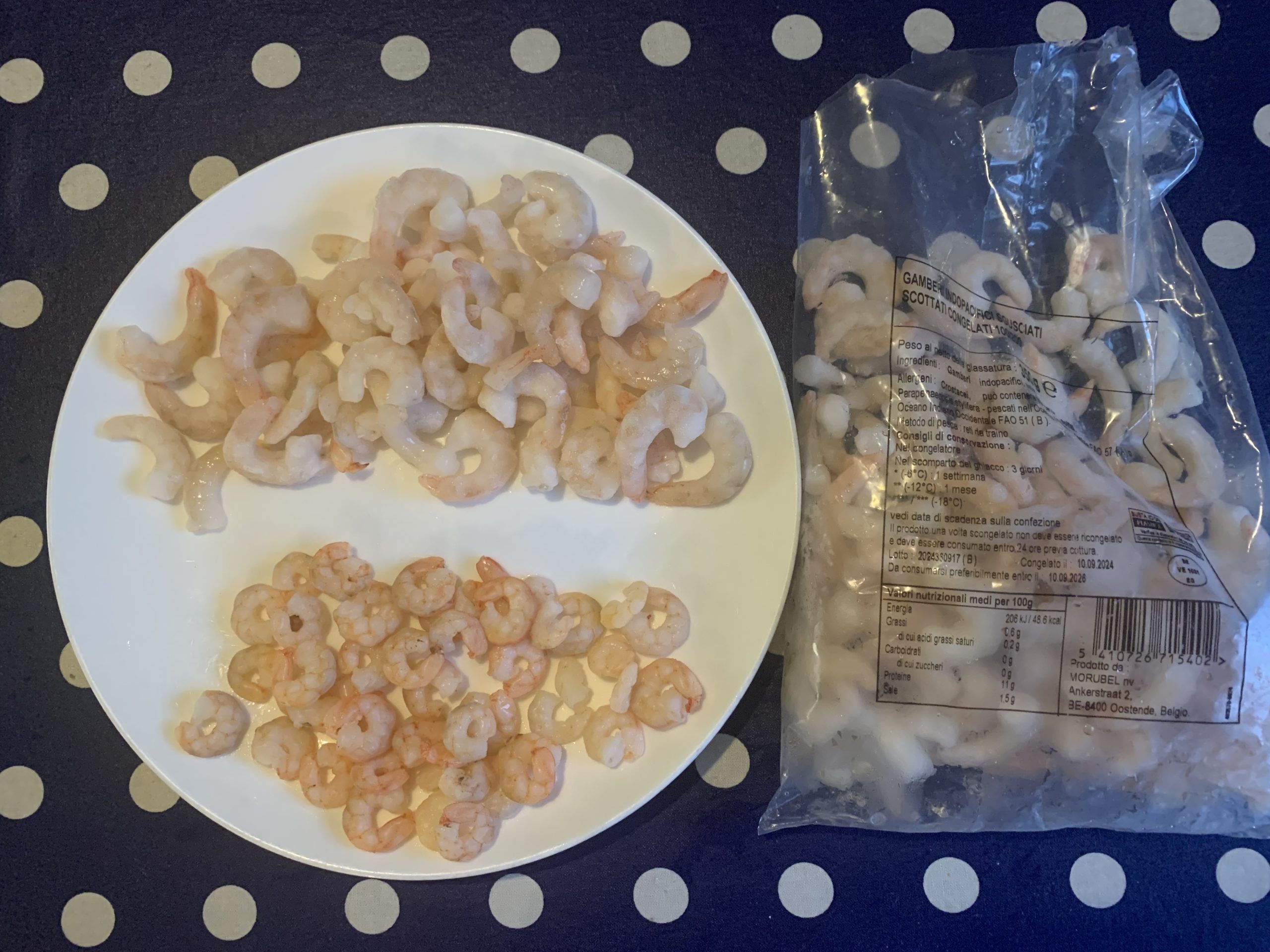 I gamberetti indopacifici surgelati venduti da Eurospin al prezzo di 3,99 € per 350 g, dopo una rapida cottura in acqua bollente, si restringono del 50% circa. Cuocere 100 g di gamberetti vuol dire trovarne la metà nel piatto (vedi foto). Per correttezza, va detto che le confezioni pesano il 20% in più rispetto a quanto riportato in etichetta, per via della glassatura esterna che protegge i gamberetti da ammaccature. Nonostante ciò, il calo di peso è davvero esagerato.