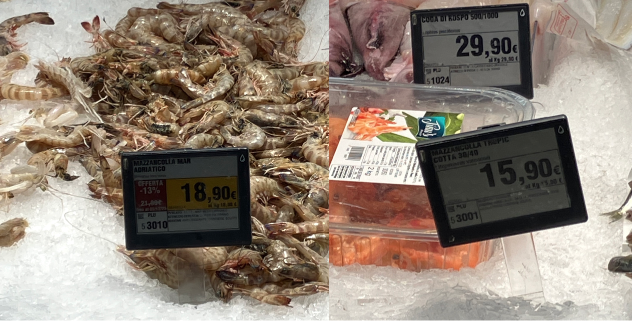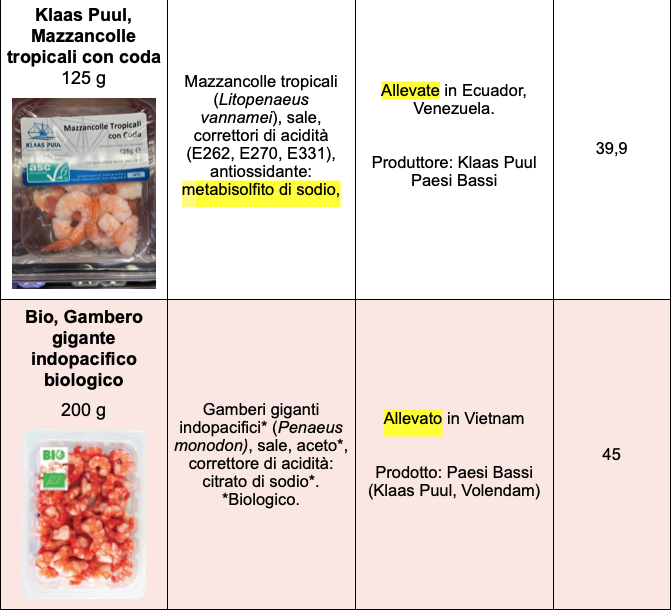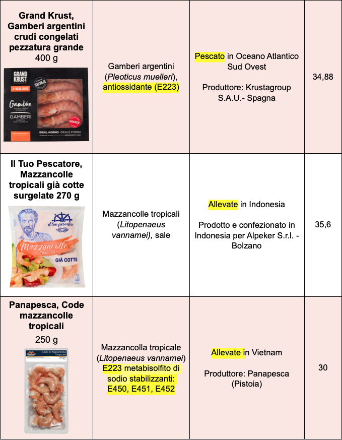 Una forbice di prezzo così ampia lascia un po’ perplessi e ci fa capire che i fattori in gioco sono numerosi. È interessante per esempio il fatto che Esselunga propone, con il proprio marchio, gamberetti boreali surgelati, pescati nei mari del Nord, privi di qualsiasi additivo, al prezzo di circa 24 €/kg, mentre i gamberetti della linea Smart, pescati in India costano solo 12 €/kg. Si spendono 12 €/kg anche i gamberetti cotti e sgusciati a marchio Simpl (Carrefour). Coop propone gamberetti boreali (pescati) a 27 €/kg, gamberi argentini pescati, già sgusciati (linea Fior Fiore) a 37 €/kg e mazzancolle allevate in Vietnam, già cotte e sgusciate (linea Spesotti) a 20 €/kg. Quali sono le differenze? Abbiamo rivolto la domanda alle catene Coop ed Esselunga ma non abbiamo ricevuto risposta.