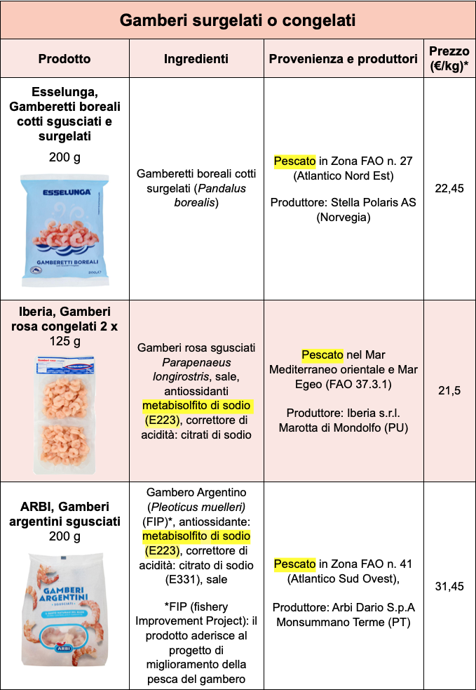 Lo stesso vale per i prodotti da freezer, confezionati: possono essere interi oppure già sgusciati e privati della testa, di colore grigio oppure rosato, più carico se sottoposti a una breve cottura. Leggendo le etichette, vediamo che in alcuni casi gli ingredienti sono semplicemente gamberi e sale, ma generalmente sono trattati con metabisolfito di sodio (E223) e/o con acido citrico o citrati (E330 e E331). Altre sostanze in etichetta possono essere acido acetico (E260) o acido lattico (E270), sostanze prive di controindicazioni che facilitano la conservazione. In alcuni casi troviamo anche difosfati (E450), trifosfati (E451) o polifosfati (E452), additivi che tendono a trattenere acqua, usati come stabilizzanti, classificati come poco raccomandabili nella banca dati sugli additivi di Altroconsumo.
