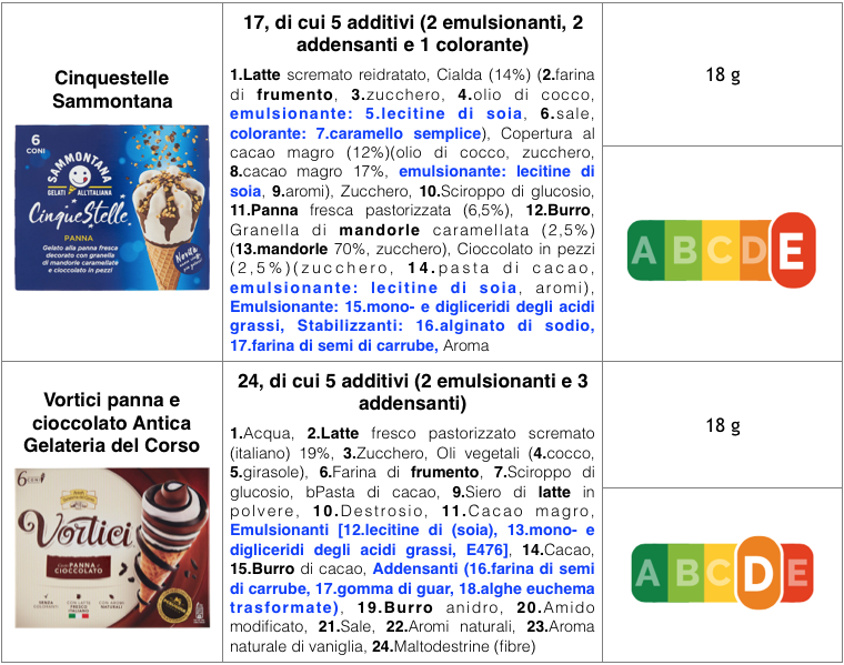 - Sette ingredienti sono additivi alimentari: quattro sono emulsionanti, ovvero i mono e digliceridi degli acidi grassi (E 471), le lecitine di soia e di girasole (E 322) e i fosfatidi di ammonio (E 442); tre sono addensanti, cioè la farina di semi di carrube (E 410), la gomma di guar (E 412) e la carragenina (E 407). Questi additivi sono aggiunti affinché il gelato, una volta tolto dal congelatore non si sciolga rapidamente nelle mani di chi lo vuole gustare, ma rimanga consistente il tempo necessario per consumarlo.