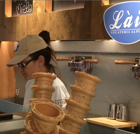da http://www.ilfattoalimentare.it/eataly-smeraldo-nuova-gelateria-alpina.html : “Chiediamo spiegazioni a Paola Daccà operation manager di Lait, che ci mostra le mantecatrici di nuova generazione posizionate dietro la parete, ottenute apportando alcune modifiche ai modelli tradizionali. Il nostro segreto è che il gelato viene mantecato in tempo reale ed esce dai rubinetti alla temperatura di – 6° e finisce direttamente sulla cialda.”