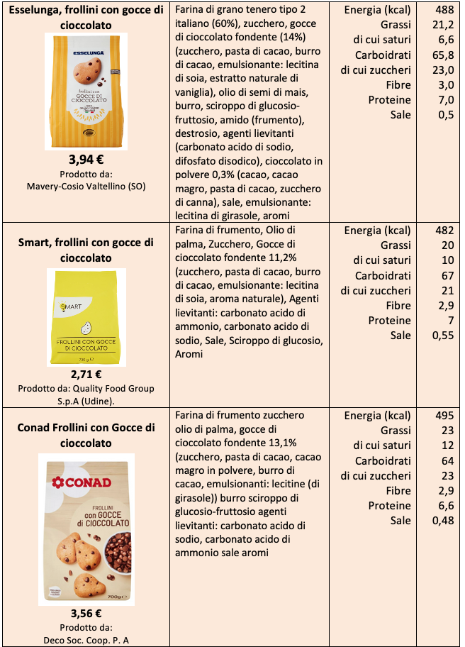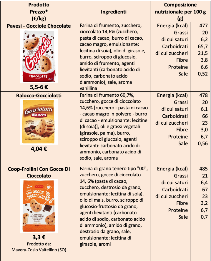 Gli ingredienti sono simili: farina, zucchero, cioccolato in gocce, poi grassi – spesso olio di girasole, di mais, di palma e/o burro – sciroppo di glucosio, agenti lievitanti e aromi. La percentuale di cioccolato è del 14,6% nei biscotti Pavesi, Balocco, Coop, Realforno (Lidl) e Pam, scende al 14% nei frollini Esselunga, al 11,2% in quelli Smart e al 13,1% nei biscotti Conad.