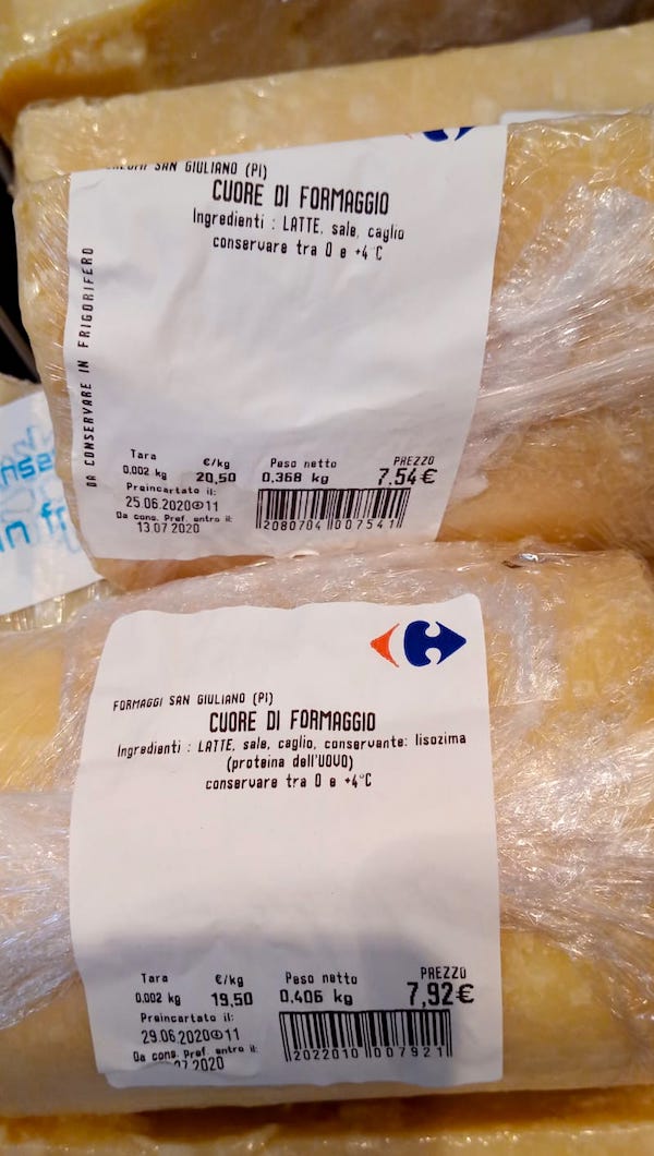 Recandomi in un punto vendita Carrefour di zona (San Giuliano Terme, Pisa) continuo a trovare nel reparto dei formaggi, nella parte del banco dedicata ai più noti formaggi a pasta dura nazionali (Grana Padano e Parmigiano Reggiano), delle pezzature ambigue con nessuna caratteristica che li renda riconoscibili e a prezzi differenti.