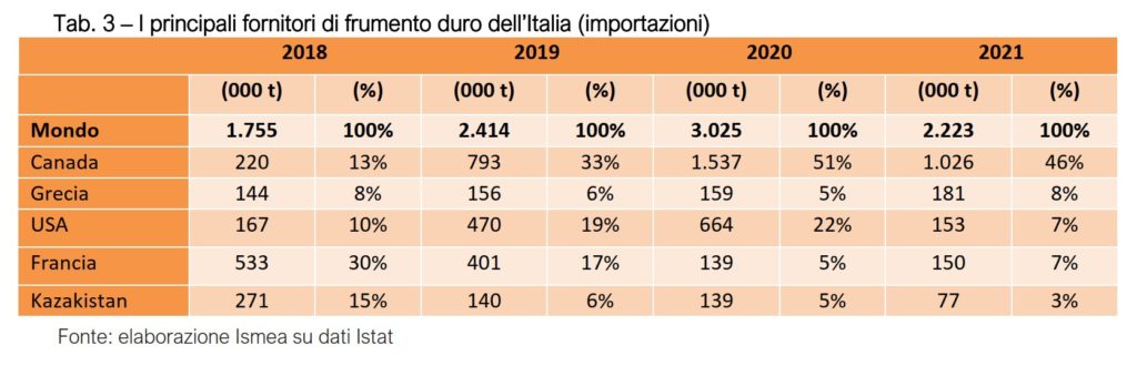 Canada e Italia sono i principali produttori mondiali di frumento duro. Tuttavia, a causa dell’ampio utilizzo interno da parte dell’industria pastaria italiana, solo il Canada esprime un peso consistente sul fronte delle esportazioni, mentre l’Italia è il primo paese importatore. Russia e Ucraina hanno un ruolo del tutto marginale, sia dal lato dell’offerta sia per quanto riguarda le esportazioni, dato che insieme rappresentano poco più del 2% dell’export globale. È quindi chiaro che per il frumento duro, solo fattori antecedenti la guerra e collegati alla scarsa produzione del Canada e all’incremento dei costi di trasporto hanno impattato sull’aumento dei prezzi della materia prima (+81% da febbraio 2020 a febbraio 2021). L’Italia è sempre stata una forte importatrice di frumento duro com arrivi da Canada, USA, Grecia, Francia e Kazakistan ma con volumi minimi dalla Russia, mentre l’Ucraina non figura fra i paesi fornitori (vedi tabella).