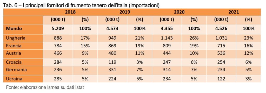 Il mercato mondiale del frumento tenero è fortemente influenzato da Russia e Ucraina che esprimono rispettivamente, il 21% e il 10% delle esportazioni mondiali. Le esportazioni di frumento tenero di Russia e Ucraina sono indirizzate in maggior misura verso Egitto, Tunisia, Turchia, alcuni paesi asiatici e alcuni africani, probabilmente in ragione di un livello qualitativo non sempre in grado di soddisfare i parametri tecnologici più alti. Le importazioni dell’Italia complessivamente sono molto consistenti e rappresentano circa il 60% degli utilizzi interni, ma i principali paesi fornitori sono all’interno dell’Ue.
