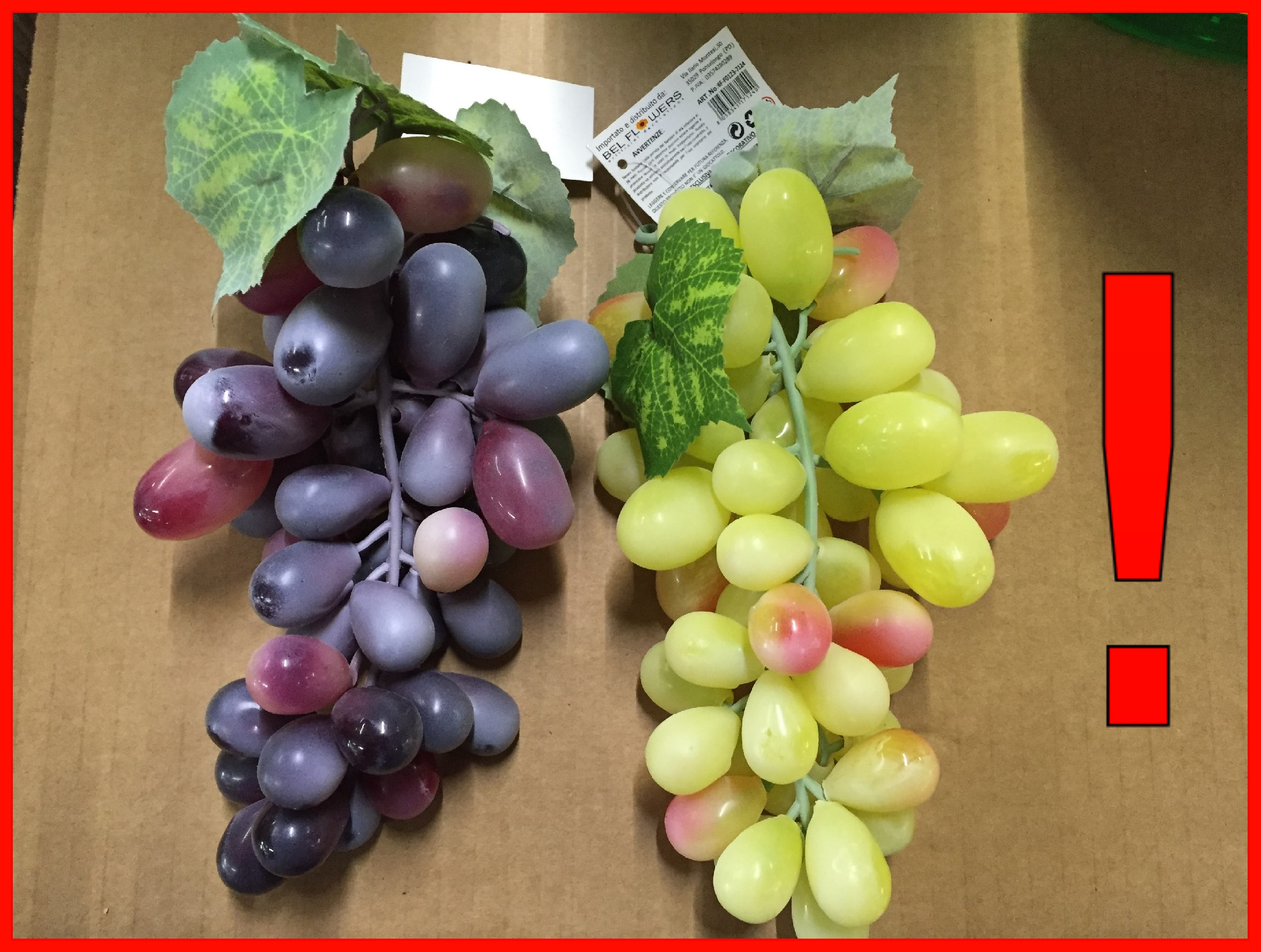 Nei giorni scorsi il Comando dei carabinieri per la sanità di Treviso ha sequestrato di grappoli d’uva di plastica importati dalla Cina, e venduti come decorazioni floreali presso il supermercato Aumai della ditta SAMA srl a Conegliano (TV). I finti grappoli d’uva in materiale plastico colorato (vedi foto), hanno un aspetto molto realistico (codice articolo BF-F01237124) e sono composti da 45 acini ovali di 1,6-1,9 cm di diametro e 2,5-3,1 cm di lunghezza .