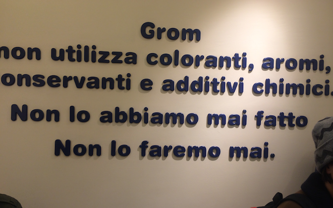 “A seguito del nostro ultimo articolo sul marketing della catena di gelaterie Grom – ci scrive un lettore – mi sembra che la polemica sia fondata sul nulla e lo dimostrate voi stessi anche in questo articolo: prima riportate la frase intera corretta “Grom non utilizza coloranti, aromi, conservanti e additivi chimici.” poi quando vi fate la domanda fatidica, riportate solo una parte e mette i puntini sul resto: “Ma se gli additivi che usa Grom sono almeno tre, perché le scritte sui muri (vedi foto sotto) dicono che “Grom non utilizza coloranti, aromi e additivi chimici…”?