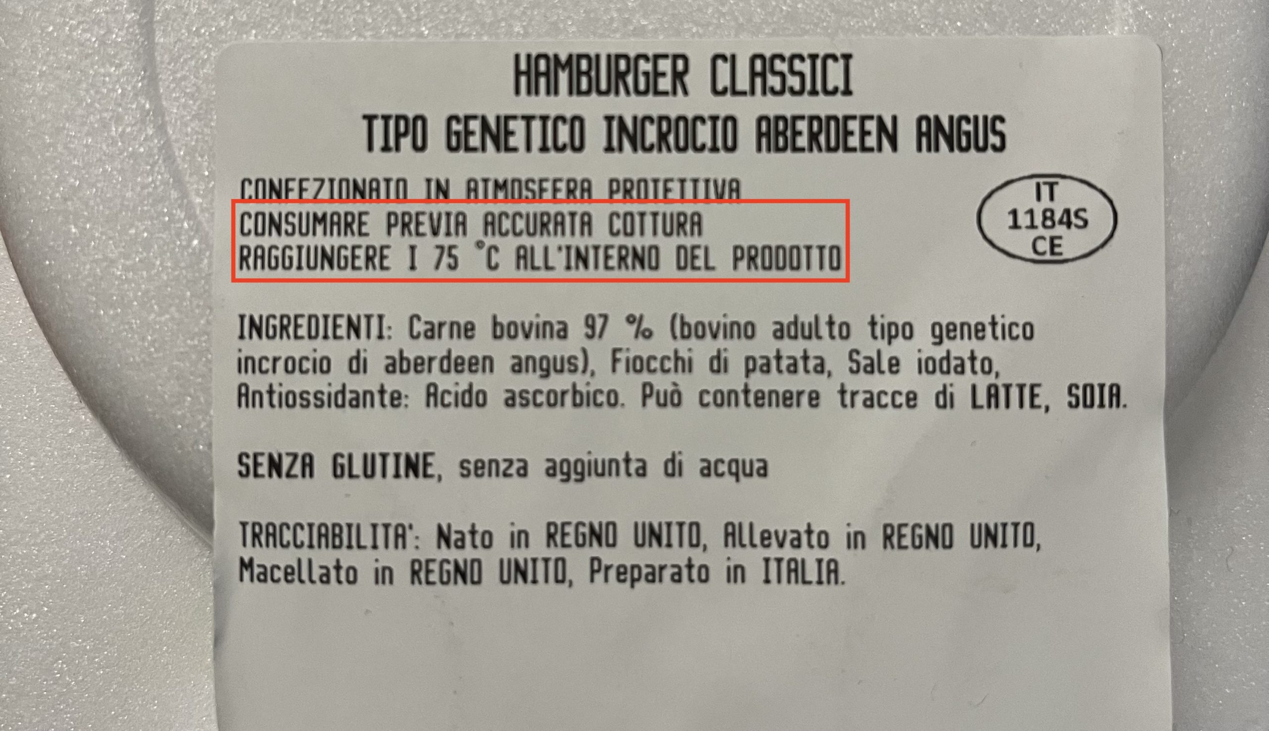 “Consumare previa accurata cottura. Raggiungere i 75°C all’interno del prodotto.” Sono le istruzioni di preparazione che campeggiano sull’etichetta di una confezione di hamburger di bovino a marchio Esselunga. Ma come facciamo a sapere di aver raggiunto la temperatura giusta? Non sarebbe meglio dare una tempistica precisa per la cottura di questi prodotti? In realtà, non è così semplice, perché dipende da diversi fattori, come la modalità di cottura e lo spessore della carne.