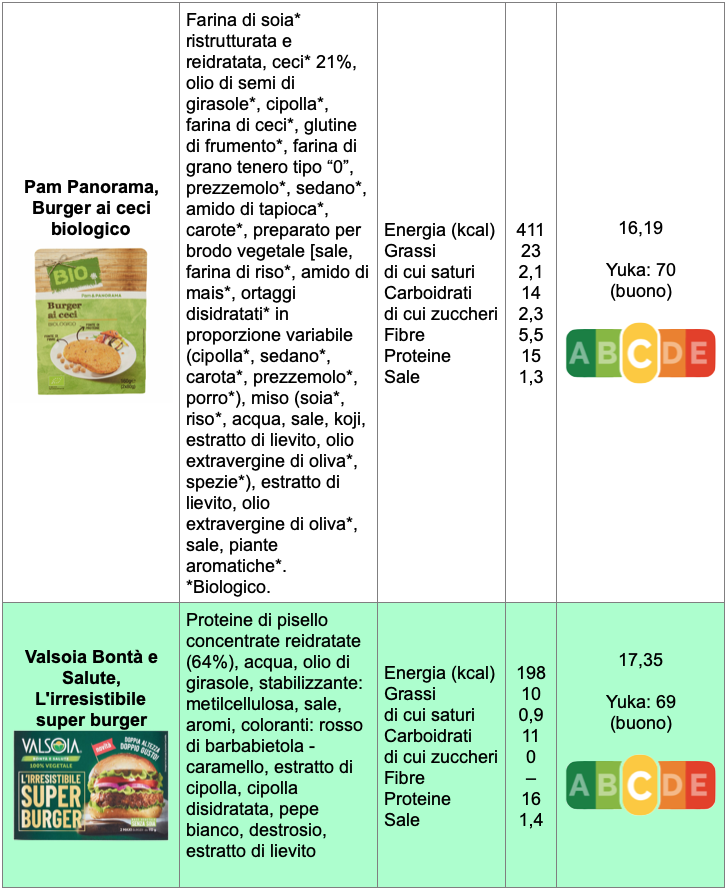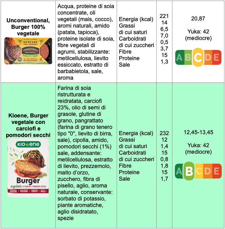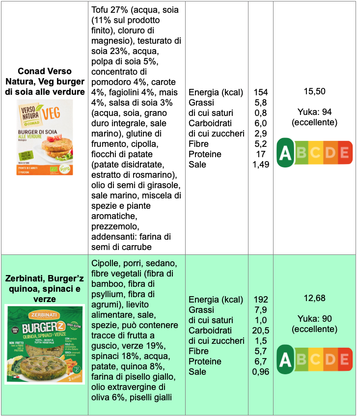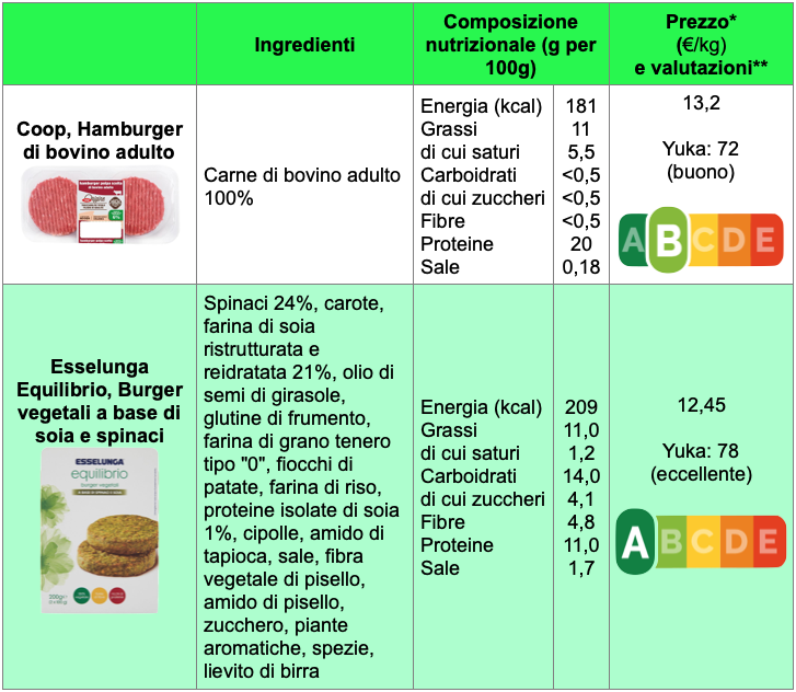 È chiaro quindi che bisogna sempre leggere le etichette con attenzione, considerando grassi, proteine, sale e anche la presenza di additivi come conservanti, presenti per esempio nel burger Kioene, o aromi, nell’Unconventional burger e nel prodotto Valsoia, di cui possiamo fare a meno. Questo tipo di considerazioni vale comunque anche per il prodotti di carne bovina, perché gli hamburger di carne 100% sono una piccola parte, mentre spesso prevedono aggiunte, come pangrattato, fiocchi di patate, erbe aromatiche e sale. Inoltre, il tenore di grassi saturi varia notevolmente a seconda del taglio utilizzato.
