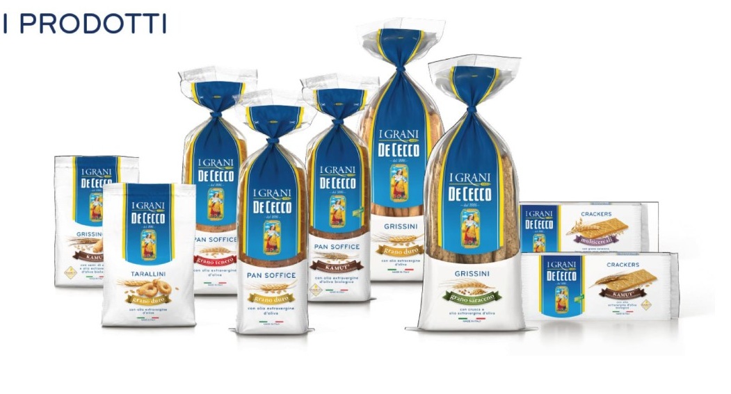 Presto arriverà sugli scaffali una linea di prodotti De Cecco destinati a sostituire il pane. La linea si chiama “I Grani De Cecco” e ogni tipologia di pane si presenta in una confezione elegante, con una fascia bianca sulla quale campeggiano i colori azzurro e giallo tipici dell’azienda. Si tratta di un packaging che richiama abbastanza le confezioni di pasta biologica.