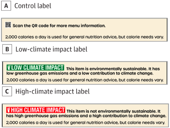 Il primo tipo di menu era di controllo, cioè con le classiche indicazioni relative sale, zucchero, grassi, calorie e altro, tutte reperibili con la lettura di un codice QR (vedi immagine sotto). Il secondo riportava, per alcuni piatti, l’impatto ambientale positivo, indicato con un riquadro verde e la scritta: “Basso impatto climatico; questo prodotto è sostenibile dal punto di vista ambientale. È associato a basse emissioni e dà un basso contributo al cambiamento climatico”. La sostenibilità era quindi proposta promuovendo i piatti migliori (pollo, pesce e opzioni vegetali). Il terzo tipo, invece, aveva un riquadro rosso accanto ad alcuni piatti, con la scritta “Elevato impatto climatico”, accompagnato dall’indicazione “Questo prodotto non è sostenibile da un punto di vista ambientale, è associato a emissioni elevate e contribuisce in misura elevata al cambiamento climatico”. In questo caso, quindi, si sottolineavano gli aspetti negativi di alcuni piatti (manzo).