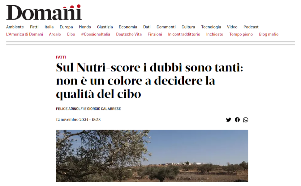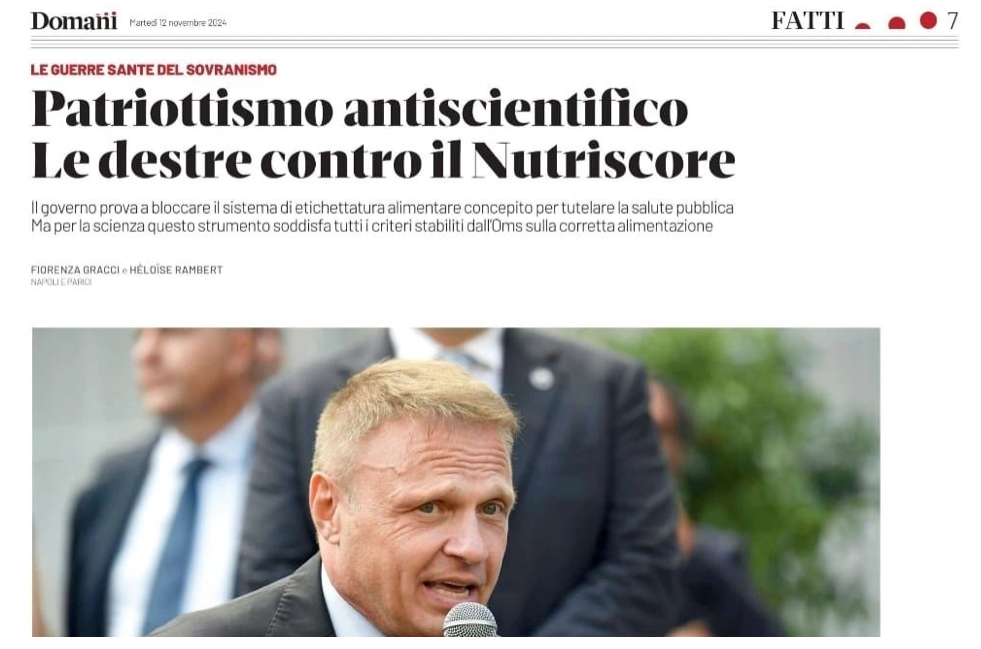 Il quotidiano Domani nell’edizione cartacea (12/11/2024), per la prima volta (!) in Italia, ha pubblicato un articolo informativo sulla situazione dell’etichetta fronte pacco Nutri-Score. Le autrici sono due giornaliste scientifiche, Fiorenza Gracci e Héloïse Rambert (che lavorano rispettivamente in Francia e in Italia), e hanno intervistato i professori Serge Hercberg, Walter Ricciardi, Rosita Gabbiannelli e anche il sottoscritto.