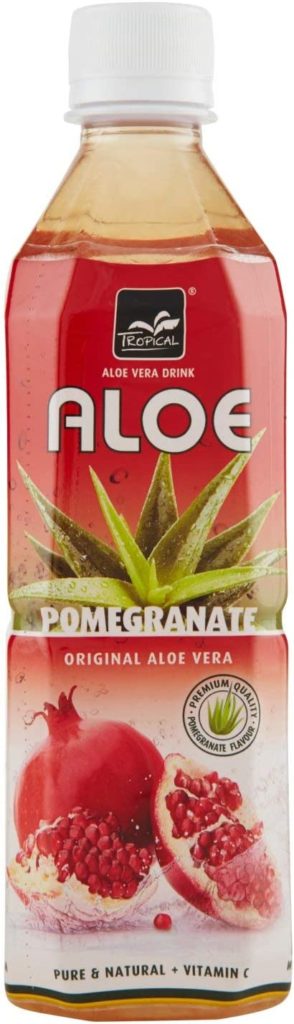 Nella bevanda Arizona al Tè verde e melagrana il succo di frutta rappresenta il 5% della bevanda e il melograno, in particolare l’1,6%. Una bottiglia di questa bibita, pari a 500 ml, contiene 8 ml di succo di melograno…e oltre 40 g di zucchero. Interessante è anche la bevanda Aloe vera Pomegranate (a marchio Tropical), con la denominazione commerciale di bevanda analcolica con Aloe Vera gusto Melograno. Qui il succo di Aloe è presente per il 20%, ma del melograno c’è solo l’aroma!