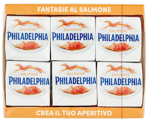 Rimanendo sul gusto “pesce”, le Fantasie al salmone Philadelphia, piccole porzioni di formaggio spalmabile, contengono solo l’1,5% di salmone, affiancato dagli “aromi”.