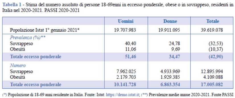 Un terzo degli italiani, circa 17 milioni, sono considerati obesi (4 milioni) o in sovrappeso (13 milioni). Il 51,5% sono uomini, mentre le donne raggiungono il 34,5%: la media è del 42,90% (vedi tabella). La situazione più critica si registra in Campania, dove l’eccesso ponderale interessa il 59% dei maschi e il 42% delle femmine. I dati sono pubblicati sul Bollettino epidemiologico nazionale dell’Istituto superiore di sanità (*), ma sarebbe sbagliato limitarsi a valutare la questione come un fenomeno di costume, perché l’incremento ponderale generalizzato è nei fatti un problema sanitario che comporta seri risvolti per la salute. L’eccesso di peso favorisce l’insorgenza di numerose patologie e/o aggrava quelle preesistenti, riducendo la durata della vita e peggiorandone la qualità. In Italia, si stima che l’eccesso ponderale causi oltre 64mila decessi l’anno (pari al 10% del totale) e oltre 571mila anni vissuti con disabilità (1). Per quanto riguarda la popolazione infantile, siamo fra i Paesi europei con la maggior prevalenza di sovrappeso e obesità (2). Non siamo di fronte a comportamenti che possiamo fare rientrare nella sfera privata, perché la questione comporta un incremento delle malattie croniche non trasmissibili con costi sanitari rilevanti a carico della collettività.