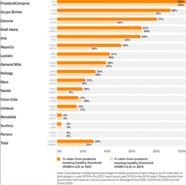 Tutte le altre grandi multinazionali restano sostanzialmente stabili, come Kellogg (70% di cibi poco sani), Mars (78%) e Mondelēz (96%), o addirittura peggiorano, aumentando le vendite di prodotti poco salutari, come Coca-Cola (83%) e Unilever (84%). È descritta come ‘stagnante’ anche la situazione di Ferrero, le cui vendite continuano ed essere rappresentate da alimenti nutrizionalmente sbilanciati..