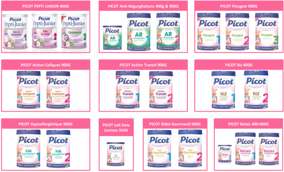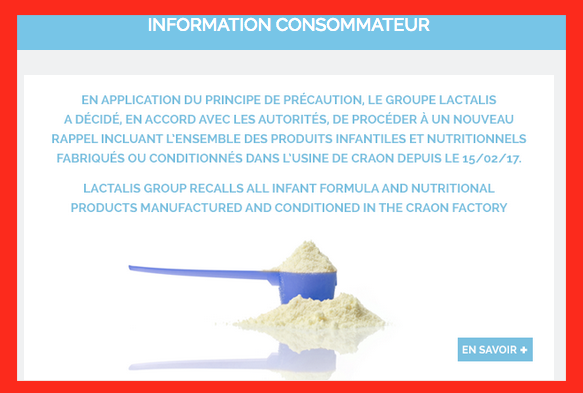 Il 10 dicembre 2017 viene diffuso un comunicato del Ministero dell’Economia che spiega la causa (presenza di Salmonella Agona) e indica il riscontro del contaminante in 26 neonati di età inferiore ai 6 mesi. Sulla base di questi casi e di una valutazione del rischio il Ministro dispone il ritiro dal mercato di 12 prodotti confezionati nello stabilimento a partire dal febbraio 2017. Finora si contano 35 casi di neonati colpiti in Francia, uno in Spagna, mentre un altro in Grecia resta da confermare. Lactalis risarcirà “tutte le famiglie che hanno subito un danno da contaminazione di salmonella”, ha detto l’amministratore delegato Emmanuel Besnier, in un’intervista al Journal du Dimanche.