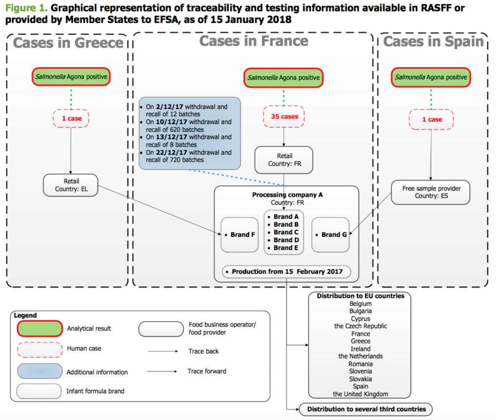 In seguito all’identificazione di un numero inusualmente alto di casi di Salmonella Agona tra i bambini con meno di un anno in Europa, l’indagine epidemiologica ha permesso di collegare le infezioni a sette marchi diversi di formula per neonati (5 in Francia, 1 in Spagna e 1 in Grecia), tutti prodotti nello stesso stabilimento in Francia. Le autorità francesi hanno iniziato a indagare sull’impianto e hanno allertato il Rasff. In seguito, un totale di 1370 lotti di latte in polvere e altri alimenti prodotti nello stesso stabilimento sono stati richiamati e ritirati dagli scaffali in 13 paesi europei (Belgio, Bulgaria, Cipro, Repubblica Ceca, Francia, Grecia, Irlanda, Paesi Bassi, Romania, Slovenia, Slovacchia, Spagna e Regno Unito) e altri 54 paesi, con quattro provvedimenti diversi tra il 2 e il 22 dicembre 2017. L’iniziale annuncio di 83 stati coinvolti non ha trovato riscontri.