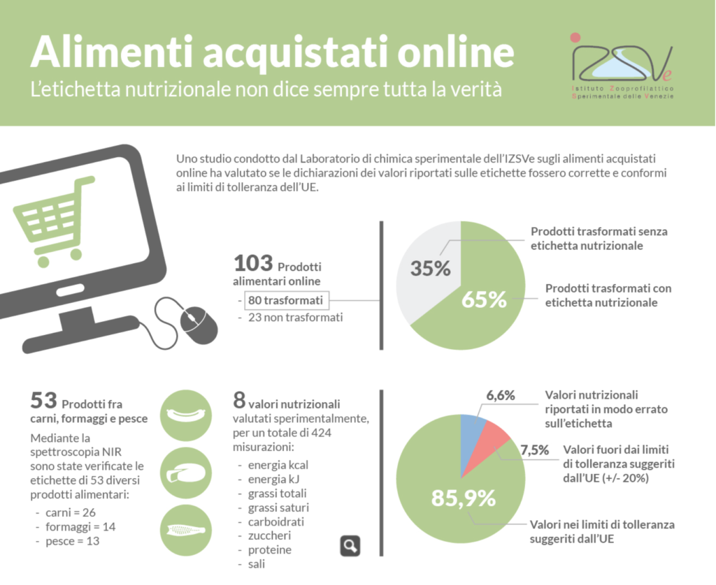 Un’indagine condotta dal Laboratorio di chimica sperimentale dell’IZSVe (pubblicata sulla rivista scientifica Journal of Near Infrared Spectroscopy), ha verificato la veridicità delle etichette nutrizionali di prodotti alimentari acquistati online utilizzando la spettroscopia nel vicino infrarosso (NIR). Su un campione di 103 prodotti venduti su una nota piattaforma e-commerce, ben il 35% degli 80 prodotti trasformati non recava etichette nutrizionali sulla confezione. Inoltre, il 35,8% dei campioni su cui è stato possibile eseguire le analisi ha mostrato almeno un valore fuori dai limiti di tolleranza rispetto alle norme UE. I campioni di cui è stato possibile verificare le etichette appartenevano a 53 diversi prodotti, suddivisi tra carne, formaggio e pesce, e sono stati presi in considerazione otto valori nutrizionali (energia kcal, energia kJ, grassi totali, grassi saturi, carboidrati, zuccheri, proteine, sale), per un totale di 424 misurazioni.