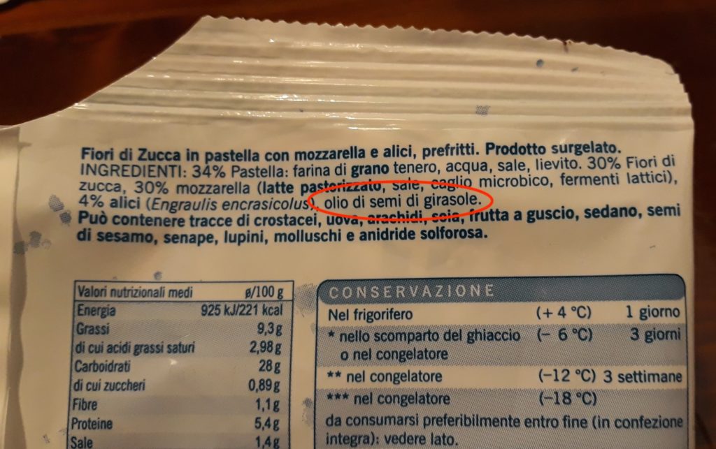 Gentile Redazione, vorrei segnalare un’etichetta di un prodotto surgelato Lidl (fiori di zucca in pastella con mozzarella e alici) che riporta nella lista degli ingredienti l’uso di olio di semi dio girasole ma poi in una zona della confezione distante da questo elenco completo comprare la dicitura: “Oli vegetali : oli sansa e di oliva e olio di semi semi di arachide”. Non capisco per quale motivo sono stati indicati separatamente questi oli rispetto agli altri. Vorrei sapere se il prodotto contiene o non contiene i due oli descritti (sansa di oliva e semi di arachide).