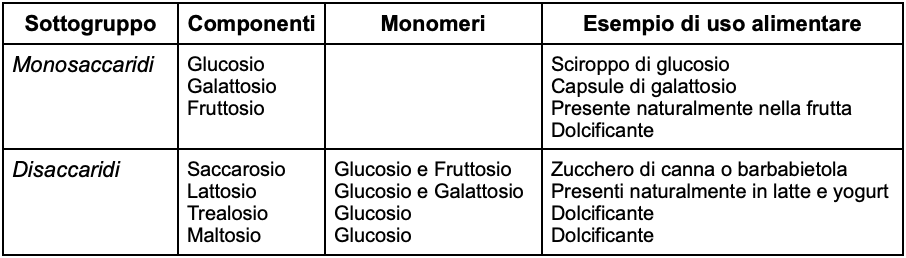 Mentre monosaccaridi e disaccaridi sono considerati carboidrati semplici che possono trovarsi fuori (estrinseci) o formare parte della struttura interna degli alimenti (intrinseci),nel articolo si fa soltanto riferimento ai carboidrati semplici.