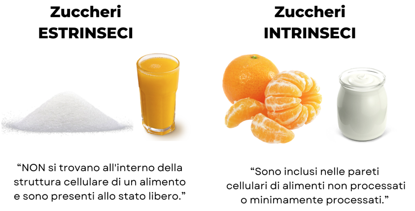 Quando parliamo di zucchero e delle conseguenze di un consumo eccessivo, di quale tipologia di zuccheri stiamo parlando? Nello specifico, parliamo di zuccheri estrinseci, quelli che non si trovano all’interno della struttura cellulare di un alimento e sono presenti allo stato libero come nei succhi di frutta o vengono aggiunti ad alimenti trasformati, mentre sono definiti zuccheri intrinseci quelli inclusi nelle pareti cellulari di alimenti non processati e che per questo motivo ne costituiscono parte integrante (1).