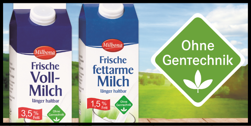 Dall’11 luglio 2016 il latte Milbona della catena tedesca di supermercati discount Lidl proviene da mucche alimentate con mangimi che non contengono ingredienti geneticamente modificati. Da settembre saranno certificati come prodotti “senza ingegneria genetica” anche i formaggi a marchio Lidl. Il prezzo del latte non subirà variazioni e continuerà ad essere venduto, in Germania, a 0,46 euro al litro. Lidl ha però deciso che i produttori saranno compensati con un bonus per i maggiori costi da sostenere.