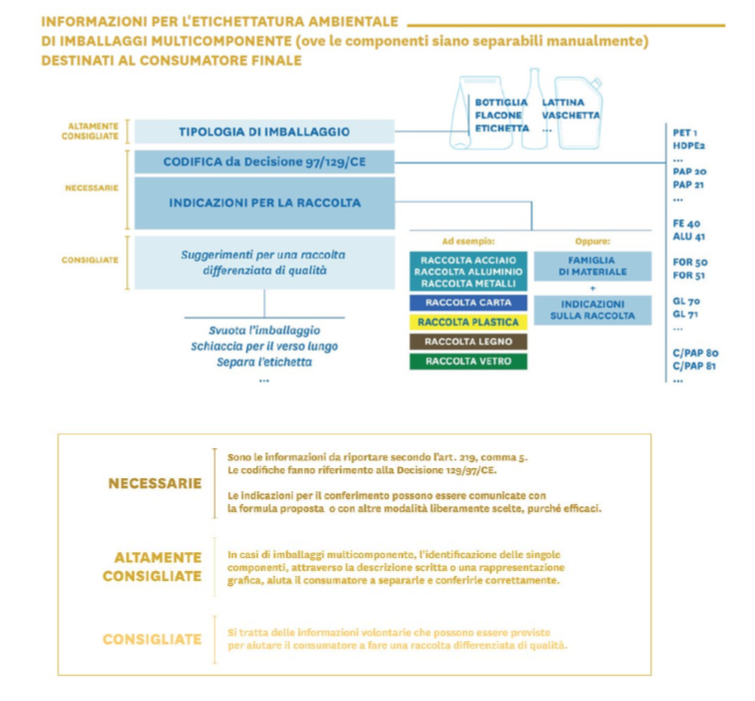 Vediamo quali sono le indicazioni più utili per una corretta lettura e valutazione. Le informazioni contenute possono essere di tre livelli. Il primo è quello delle informazioni necessarie, che permettono di rispondere alla norma. Il secondo livello riguarda le cosiddette informazioni altamente consigliate, che rendono la comunicazione più efficace. C’è infine anche il livello delle informazioni consigliate, che permettono di arricchire l’etichettatura di contenuti utili per una raccolta di qualità (vedi schema sotto).
