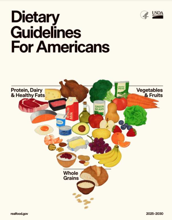Anche nelle linee guida del 2026 si ripresenta l’eterna lotta tra scienza e interessi dell’industria alimentare, ma l’amministrazione Trump in maniera sfacciata, come nel suo stile, ha deciso di favorire il business dei produttori agricoli. USDA e HHS, infatti, hanno creato una nuova piramide alimentare rovesciata (vedi foto sotto) rispetto a quella del 1991 per enfatizzare le proteine soprattutto di origine animale, privilegiando il consumo di carne e latticini, e favorendo i “grassi salutari” in primis di origine animale (!?).