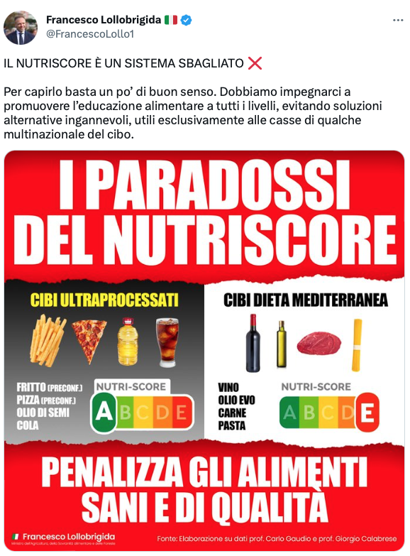 Purtroppo non si tratta di una caso isolato. Lollobrigida si è reso ridicolo a livello internazionale quando ha pubblicato un post sull’etichetta a semaforo Nutri-Score, adottata da sette Paesi europei, inventandosi colori e giudizi in modo arbitrario. Il Ministro ha diffuso anche un manifesto in cui ribadisce il concetto e dice: “La tabella del Nutri-Score infatti vede indicato con il colore rosso alcuni alimenti cardine della dieta mediterranea, come la pasta, parmigiano e l’olio d’oliva”. Questa frase è stata detta, secondo quanto riportato dall’Ansa, durante la giornata conclusiva della prima Conferenza nazionale sulla nutrizione, al Ministero della Salute nel marzo 2023.