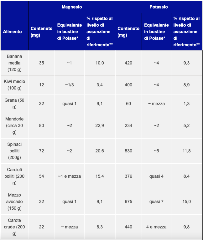 Come già accennato, possiamo tranquillamente soddisfare il nostro fabbisogno di magnesio e potassio seguendo un’alimentazione varia e bilanciata, ricca di frutta e verdura. In particolare, le principali fonti di magnesio sono cereali, meglio se integrali, verdure a foglia larga, legumi, frutta secca a guscio caffè, in alcuni casi frutti di mare e formaggi. Il potassio, invece, è presente in legumi, verdure e ortaggi, frutta, carne e pesce, latticini, cereali integrali e caffè. Anche l’acqua può contribuire all’assunzione di questi importanti microelementi.