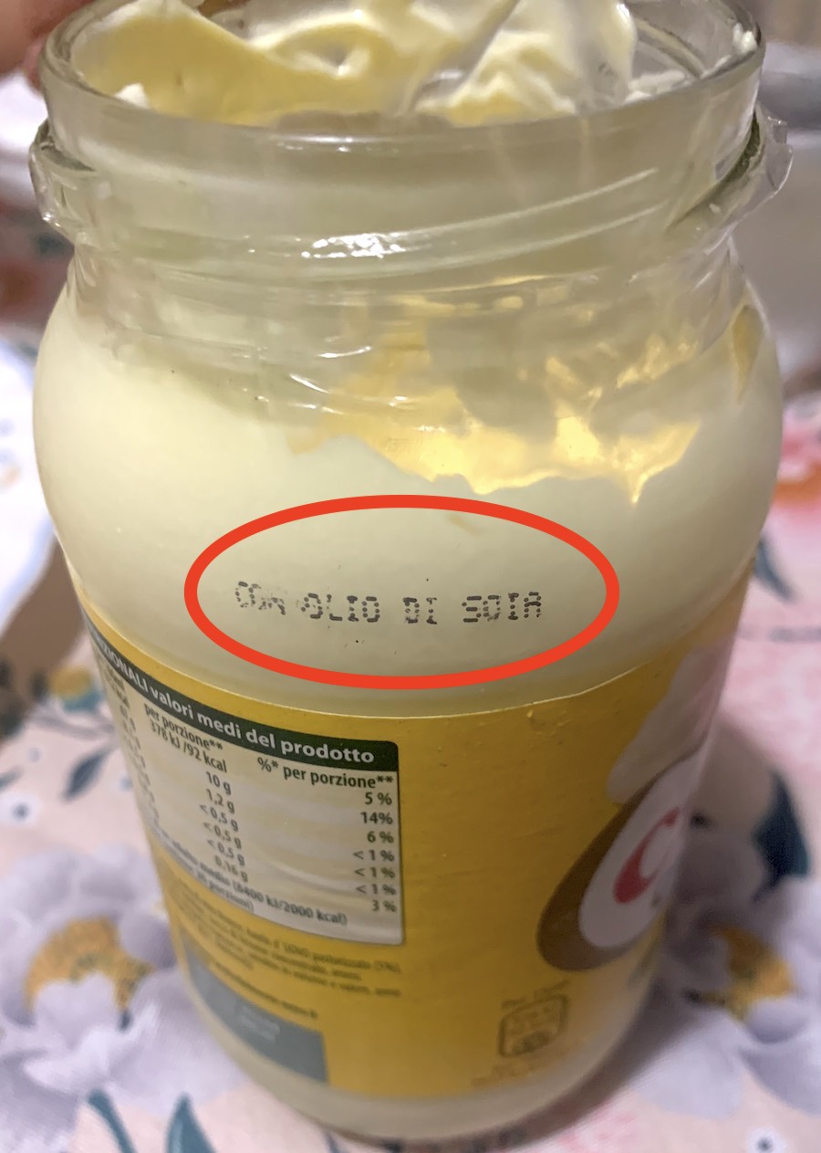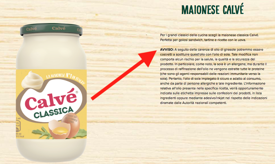 La Unilever, proprietaria del marchio Calvé, ha pubblicato sulla home page del sito dedicato alla maionese un avviso proprio su questo cambio di ingrediente specificando “in particolare, come noto, la soia è un allergene, ma durante il processo di raffinazione dell’olio ne vengono estratte tutte le proteine (che sono gli agenti responsabili delle reazioni immunitarie verso la soia). Pertanto, l’olio di soia impiegato è sicuro e adatto al consumo, anche da parte di persone allergiche a tale ingrediente.”