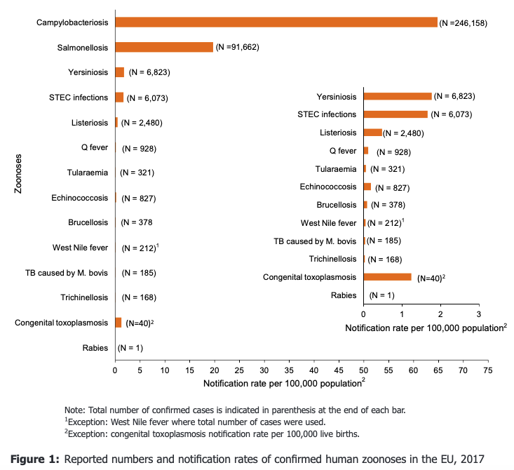 Nei 37 Paesi del continente europeo (*), che hanno partecipato alla raccolta dei dati, quasi il 70% di tutte le infezioni trasmesse da alimenti e animali sono state ancora una volta causate dal batterio Campylobacter jejuni, con quasi 250 mila casi accertati, in leggero calo rispetto al 2016. Il numero dei contagi, però, potrebbe essere sottostimato, perché in sei Stati membri, Italia compresa, la notifica dei casi di campilobatteriosi non è obbligatoria. Sono stati identificati 395 focolai di infezione con origine alimentare: i cibi che più spesso risultano contaminati sono la carne di pollo (37,4%), quella di tacchino (31,5%) e altro pollame (27,7%).