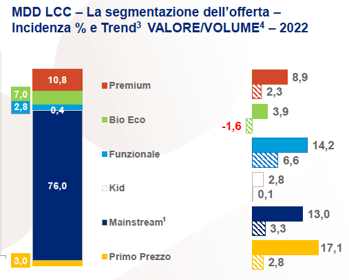 È interessante però notare che non sono aumentate solo le vendite dei prodotti ‘mainstream’, cioè i prodotti ‘basici’, ma anche quelle delle linee di alta gamma – prodotti premium, salutistici, biologici ecc. – caratterizzate da prezzi più elevati. Il 76% dei prodotti Mdd veduti nel 2022 appartiene al mainstream, ma nello stesso anno i prodotti premium, legati a eccellenze del territorio, a ingredienti Igp, o metodi di produzione tradizionali, hanno pesato per il 10,8% e il fatturato, nel corso dello stesso anno, è cresciuto dell’8,9%. I prodotti delle linee ‘bio-eco’, legati a certificazioni green e biologiche, hanno conquistato una quota del mercato Mdd pari al 7%, il fatturato è cresciuto quasi del 4%, ma i volumi sono diminuiti. Sono andati bene i prodotti funzionali, quelli salutistici, senza glutine, ecc.: la quota si ferma al 2,8% ma la crescita è stata del 14,2%.