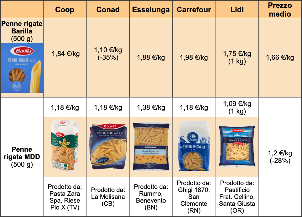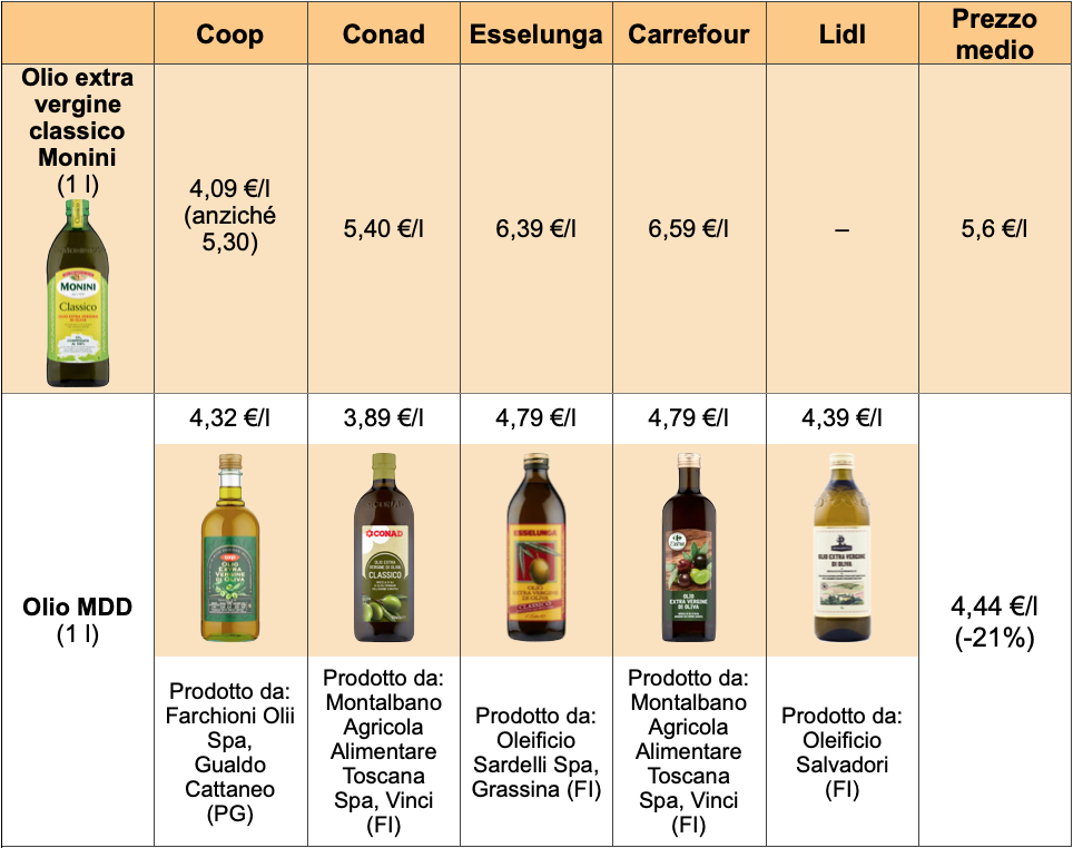 Le penne Barilla costano in media 1,66 €/kg, contro 1,2 €/kg per le penne con il marchio del supermercato: un risparmio del 28%. L’olio extravergine d’oliva Monini classico è venduto a un prezzo medio di 5,6 €/l, mentre quello con il Mdd si ferma a 4,44 €/l; in questo caso il risparmio è del 20% circa, anche perché l’olio extravergine è un prodotto civetta e quello di marca è spesso offerto in promozione.