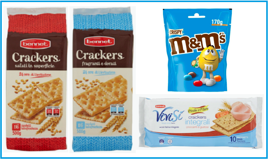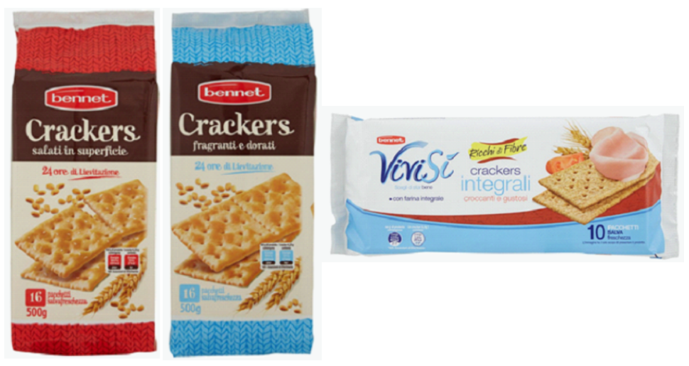 - Crackers salati Bennet, in confezione da 500 grammi, con i numeri di lotto 6031 e il Tmc 22/07/2022, e lotto 6091 e il Tmc 28/07/2022.