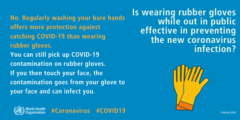 Alla domanda “Indossare guanti di gomma quando ci si trova in pubblico è efficace per prevenire l’infezione da parte del nuovo coronavirus?” la risposta è: “No. Lavare regolarmente le mani nude offre una protezione maggiore contro il Covid-19 che indossare i guanti di gomma. I guanti si possono contaminare con Covid-19. Se dopo ci si tocca il viso, la contaminazione passa dai guanti al viso e può infettare”.