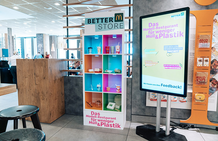 McDonald’s si attrezza per essere più sostenibile, in previsione del bando ai materiali monouso che entrerà in vigore nel 2021, e lo fa sperimentando materiali e modalità con piccoli test circoscritti a singoli locali in diversi paesi, valutandone l’esito. Uno degli ultimi test in ordine di tempo è stato condotto in Germania, dove la catena gestisce circa 1.500 ristoranti. Tra il 17 e il 26 giugno 2019, è stato realizzato il Better McDonald’s Store nel centro commerciale Mall of Berlin, ovvero un ristorante tutto improntato alla sostenibilità e totalmente privo di plastica.