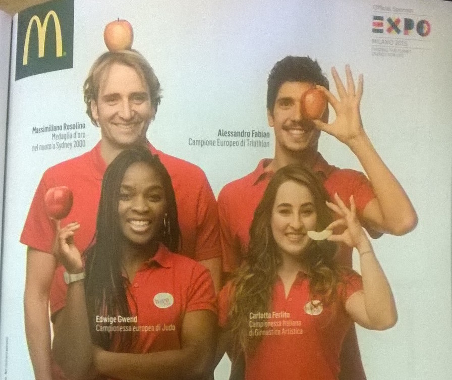 Ciò che davvero mi infastidisce in questo genere di pubblicità è il fatto che gli sportivi si prestino a sponsorizzare mac donald (non so se ingenuamente qualcuno potrebbe pensare che loro mangino il mac menu, però secondo me il messaggio di fondo vorrebbe essere anche quello).