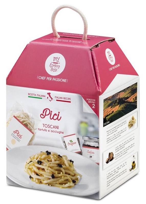 Sia SecondChef che Quomi inseriscono nella scatola tutto ciò che serve, a parte olio, sale e pepe; la start up My cooking box, invece, che propone prevalentemente kit con gli ingredienti per un’unica ricetta, fornisce anche olio e sale. In questo caso troviamo un “catalogo” di ricette più fornito, ma queste non variano con cadenza settimanale; è come al ristorante: scegliamo la ricetta e ordiniamo il numero di porzioni desiderate. Fra le proposte troviamo piatti regionali, ognuna firmato da uno chef più o meno noto: busiate alla siciliana, risotto alla milanese, pici toscani con tartufo e acciughe, mezzi paccheri campani con ventresca di tonno e pomodoro giallo, ma anche polenta bergamasca, pizza gourmet e dessert ai tre cioccolati. La scatola con gli ingredienti per due porzioni di pici toscani contiene 200 g di pici, 20 g di sale grosso, 18 g di salsa con acciughe e tartufo, 20 ml di olio evo normale e 20 ml di olio evo con aglio, 1 g di origano e 20 g di pangrattato. Costa 20 €, cui bisogna aggiungere circa 6 € di spedizione. Sicuramente è comodo, ma forse non è molto conveniente!