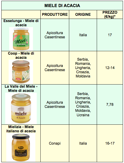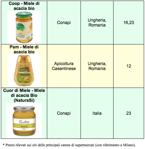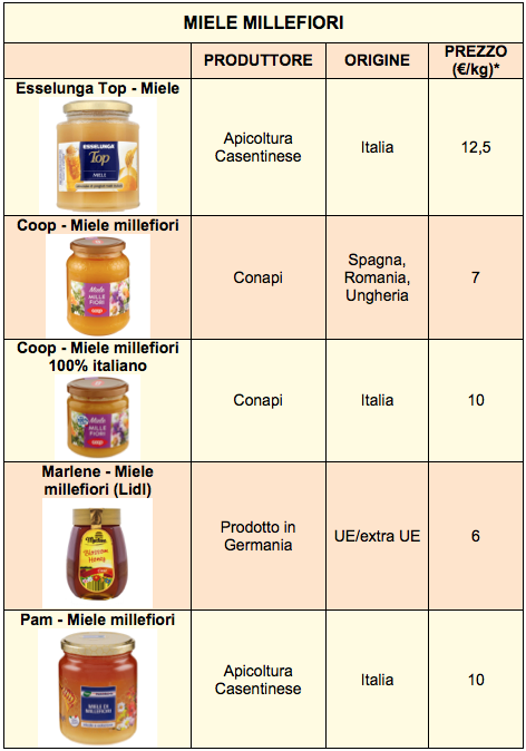 Nei siti delle principali catene di supermercati (facendo riferimento a Milano), per il miele millefiori abbiamo trovato listini medi variabili da 6 a 16 €/kg. Il più economico è quello a marchio Marlene, prodotto in Germania e venduto dalla catena Lidl (6 €/kg). Ha un prezzo basso, circa 7 €, anche quello a marchio Coop prodotto con una miscela di mieli UE/non UE; il millefiori italiano della stessa catena arriva a 10, mentre per prodotti bio servono 12-16 €/kg.