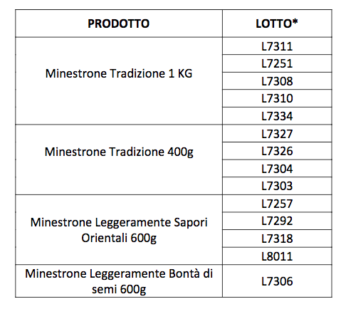 Si tratta di cinque lotti del Minestrone Tradizione nella confezione da 1 kg, poi ci sono quattro lotti del Minestrone Tradizione nella confezione da 400gr, quattro lotti del Minestrone Leggeramente Sapori Orientali da 600 g e di un lotto di Minestrone Leggeramente Bontà di semi. Il numero di lotto si trova nel riquadro bianco sul retro della confezione o sul lato a fianco del termine minimo di conservazione (vedi tabella sopra). Il richiamo è stato diffuso anche dal Ministero della salute e dai supermercati Basko, Carrefour, Gros Cidac, Il Gigante, Sogegross, Cadoro, Coop, Unes, Bennet, Iper, Decò, Penny Market, Sigma, Esselunga.