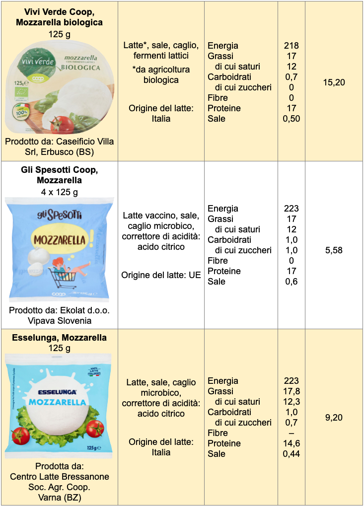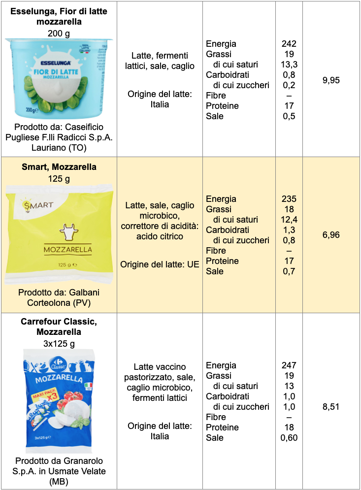 I cultori di questo formaggio preferiscono i prodotti artigianali, più diffusi al Sud, ma disponibili sempre più spesso anche nel Nord Italia. La maggior parte delle mozzarelle che arrivano nelle nostre case, però, sono industriali e di solito vengono acquistate nei supermercati, che dedicano uno spazio notevole sia a quelle di latte vaccino, più economiche, sia a quelle di bufala. In questo articolo non consideriamo la mozzarella di bufala, che nella maggior parte dei casi è prodotta secondo il disciplinare della Mozzarella di bufala Campana Dop, ma solo quelle di latte vaccino. Fra i marchi più noti troviamo Santa Lucia Galbani, Granarolo e Vallelata, inoltre ogni catena propone mozzarelle con il proprio marchio. Sono disponibili di solito in diversi formati – quello classico da 125 g, le mozzarelline e le trecce –, oltre che in versioni a basso contenuto di grassi, prive di lattosio o ad alto contenuto proteico.