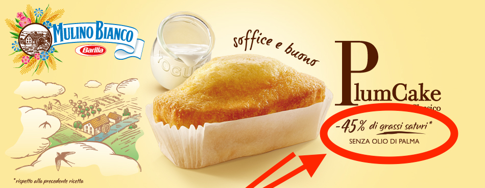 A Bologna e provincia, si trovano le confezioni du Plum Cake Mulino Bianco senza olio di plama, scritta presente anche sulla confezione.