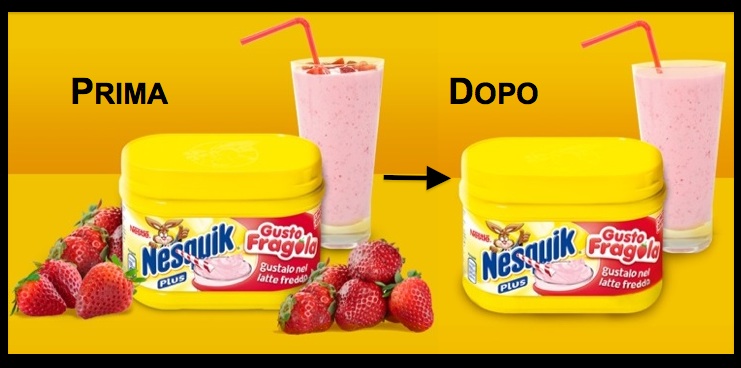 Ringraziamo Nestlé per avere deciso di cambiare le immagini di Nesquik Fragola che, come evidenziava l’articolo di Gianna Ferretti, poteva creare qualche dubbio sugli ingredienti utilizzati. Le fotografie scelte per il sito della Nestlé (e la pagina Facebook) presentavano la confezione circondata da numerose fragole fresche e mature. Basta leggere la lista degli ingredienti per rendersi conto che il gusto e il colore della fragola sono ottenuti da un abile miscuglio di aromi naturali e dal colorante rosso barbabietola. Tutto regolare invece per la confezione in vendita sugli scaffali che correttamente riportava la scritta: “gusto fragola” senza frutta intorno.