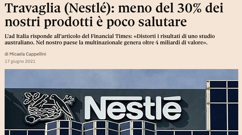 Tra gli alimenti sotto accusa rientrerebbe il 70% dei prodotti alimentari, di cui il 99% di quelli del comparto pasticceria e gelateria e il 96% delle bevande (ad eccezione dell’82% delle acque minerali e del 60% dei prodotti lattiero-caseari). Prodotti rivolti prevalentemente a un pubblico giovane, ma considerati non proprio ottimali dal punto di vista dell’apporto nutritivo. In un’intervista al Sole 24 Ore, l’amministratore delegato e presidente di Nestlé Italia e Malta, Marco Travaglia, ha ridimensionato il dato riportato dal quotidiano statunitense, sottolineando che esso non tiene conto dei prodotti ‘speciali’ (integratori, alimenti terapeutici, sostituti dietetici dei pasti), gli alimenti per la nutrizione infantile, il cibo per animali domestici e il caffè, che da soli rappresentano circa la metà del portafoglio Nestlé, da cui dipendono circa 84 miliardi di euro di entrate annuali dell’azienda. Tenendo conto di questa fetta della produzione, la percentuale dei prodotti ‘insalubri’ a marchio Nestlé si ridurrebbe a un 30%. Si tratta di una percentuale destinata ulteriormente a scendere grazie all’aggiornamento degli standard nutrizionali interni. L’azienda infatti sta già perseguendo, questa linea soprattutto per quanto riguarda la riduzione di zucchero e sodio aggiunti, calati in media del 14-15% % negli ultimi 7 anni, poi ci sono gli investimenti in una linea di alimenti 100% vegetali, proposti in Italia sotto l’etichetta Garden Gourmet.