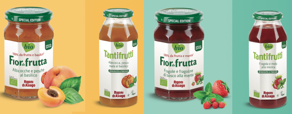 Anche Rigoni di Asiago (azienda molto afferma nel biologico) propone come novità la frutta biologica spremuta a freddo integrata con erbe aromatiche. Nella special edition del 2020 troviamo i succhi Tantifrutti in due varianti: Albicocca, pesca, mela al basilico e Fragola e mela alla menta. La nuova linea presenta un minore impatto ambientale ottenuto grazie al risparmio energetico e al materiale “eco” per l’imballo.