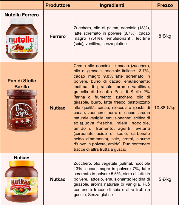 Alla fine della nostra analisi possiamo dire che le differenza fra le creme alla nocciola prodotte da Nutkao e da Ferrero solo a volte sono evidenti, come la scelta di nocciole italiane e di grassi diversi dall’olio di palma. Negli altri casi si tratta di prodotti molto simili con prezzi molto diversi. Per capire meglio va detto che il costo delle materie prime e del confezionamento di un vasetto di crema incide poco sul prezzo di vendita. Il costo degli ingredienti oscilla da 2 a 2,5 €/kg mentre i listini variano da 2,6 a circa 11 €/kg.